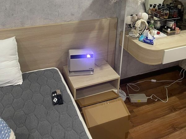 Phòng ngủ của khách hàng này có 1 bức tường trắng lớn, đã được sơn bản mịn màng và hoàn toàn không bị che khuất bởi tủ hay kệ treo. Xgimi Horizon S Max được bố trí đặt ngay ở tủ đầu giường, chiếu trực tiếp lên khoảng tường đó, vừa mở ra 1 không gian trải nghiệm giải trí màn hình lớn, lại vừa đảm bảo setup nhanh chóng, đơn giản, linh động, có thể dễ dàng mang đi mang lại giữa các phòng khi cần thiếu