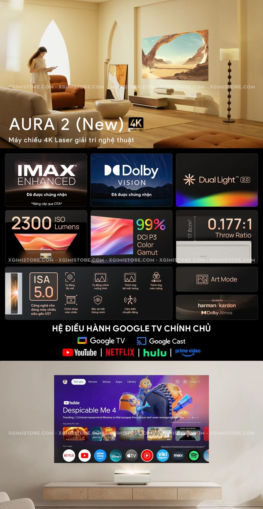 Xgimi Aura 2 New - Máy chiếu siêu gần thông minh tích hợp Google TV, nguồn sáng kép Dual Light 2.0, độ sáng 2300 ISO lumens, phân giải chuẩn 4K UHD, hỗ trợ các tính năng căn chỉnh thông minh, loa Harman Kardon, chuẩn Dolby Vision và IMAX Enhanced