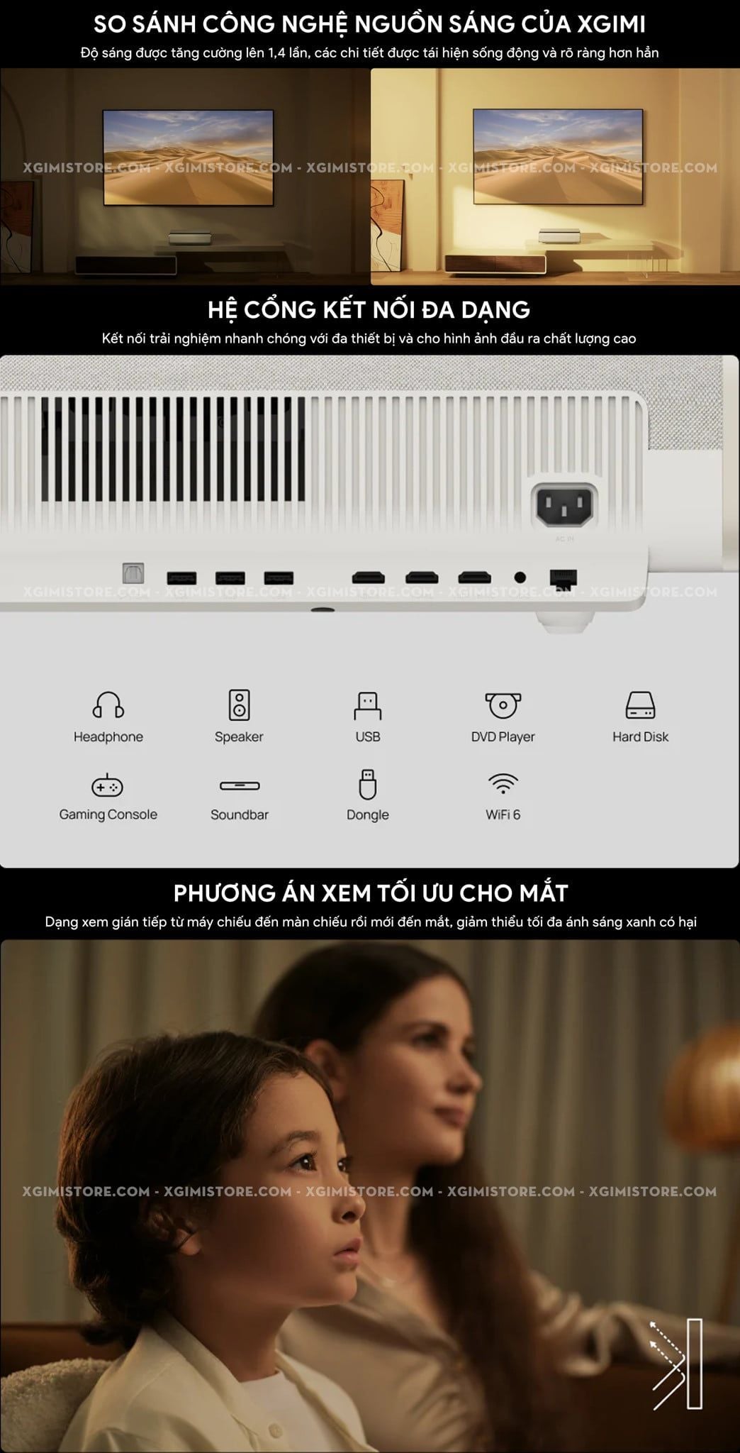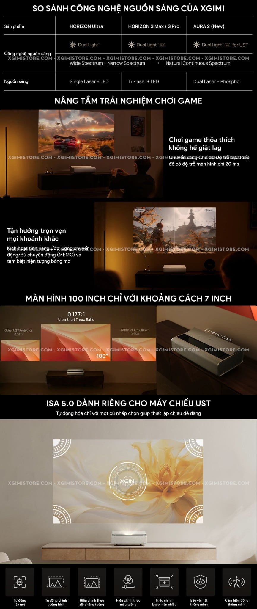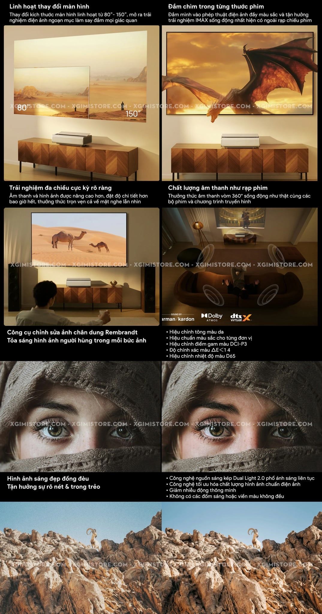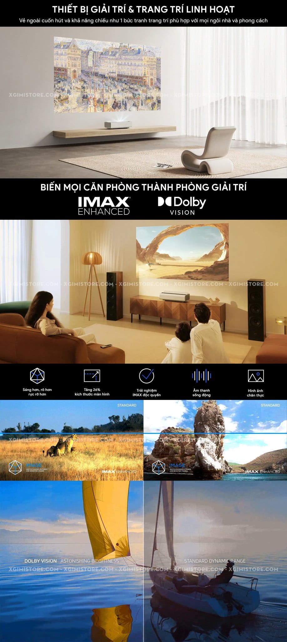 | Đặc điểm đặc biệt | Bản quyền Netflix chính chủ Chứng nhận IMAX Enhanced (OTA) Chứng nhận Dolby Vision Certified Công nghệ Dual Light 2.0 Cinema-Grade Image Quality Optimization Engine: Công nghệ tối ưu hóa chất lượng hình ảnh chuẩn điện ảnh Intelligent Dynamic Noise Reduction: Giảm nhiễu động thông minh No Scattered Sparkles or Color Edges: Không có các đốm sáng hoặc viền màu không đều Dynamic contrast 1000000:1 Google Cast/Magicast Fast Boost ≤ 16 giây ISA 5.0 Uninterrupted Auto Keystone Correction: Tự động chỉnh vuông hình ISA 5.0 Auto Focus: Tự động lấy nét ISA 5.0 Screen Alignment Assist: Căn chỉnh khớp màn chiếu ISA 5.0 Intelligent Eye Protection: Bảo vệ mắt thông minh ISA 5.0 Wall Flatness Adaptation: Hiệu chỉnh theo độ phẳng tường chiếu ISA 5.0 Wall Color Adaptation: Hiệu chỉnh màu sắc theo màu tường chiếu Eco-mode Smart Dynamic Sensing: Cảm biến động thông minh Ultra-Low Latency: Độ trễ cực thấp chỉ 20ms (AK tắt) High Dynamic Range - HDR10 Hybrid Log Gamma - HLG Bù trừ chuyển động MEMC Hỗ trợ 3D Frame Packing & Side by side |